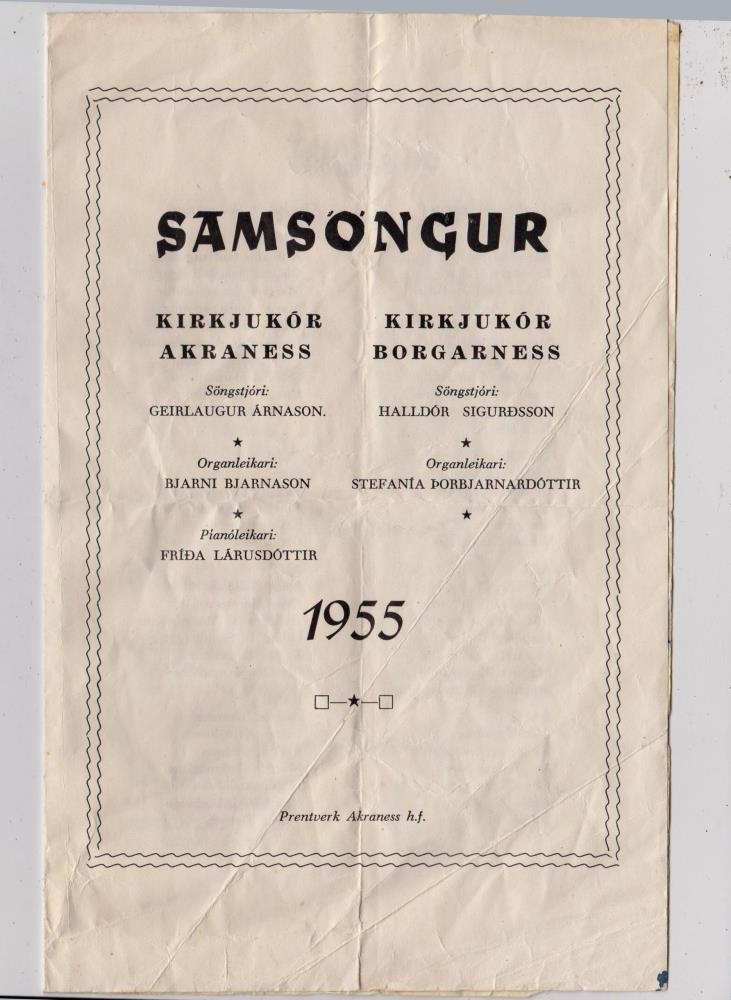Samsöngur 1955 : Kirkjukór Akraness Kirkjukór Borgarnes, söngstjórar Geirlaugur Árnason og Halldór Sigurðsson, organleikarar Bjarni Bjarnaso og Stefanía Þorbjarnardóttir, píanleikari Fríða Lárusdóttir. - 3 bls