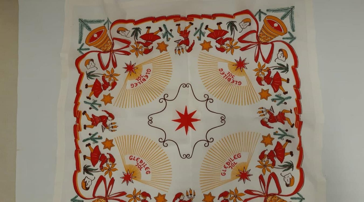 Útsaumaður jóladúkur og á honum stendur í hverju horni "Gleðileg jól".