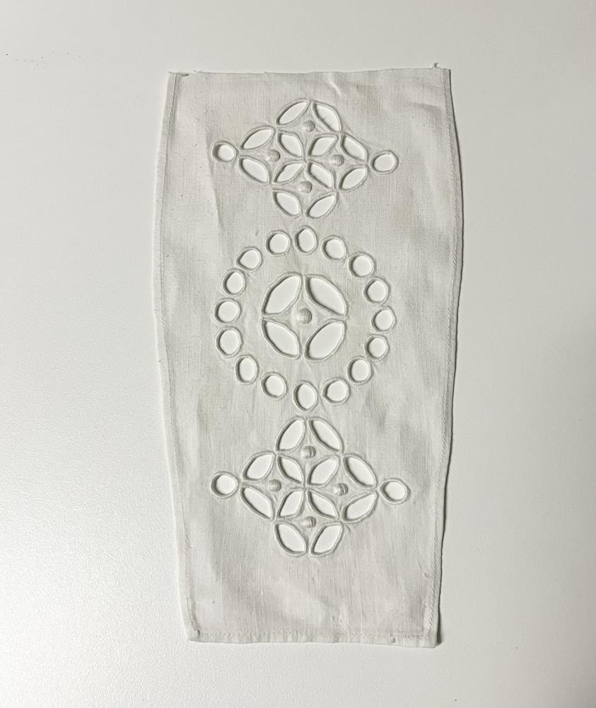 Peysubrjóst Bjargar Indriðadóttur frá Víkingavatni, mikið gatamynstur.