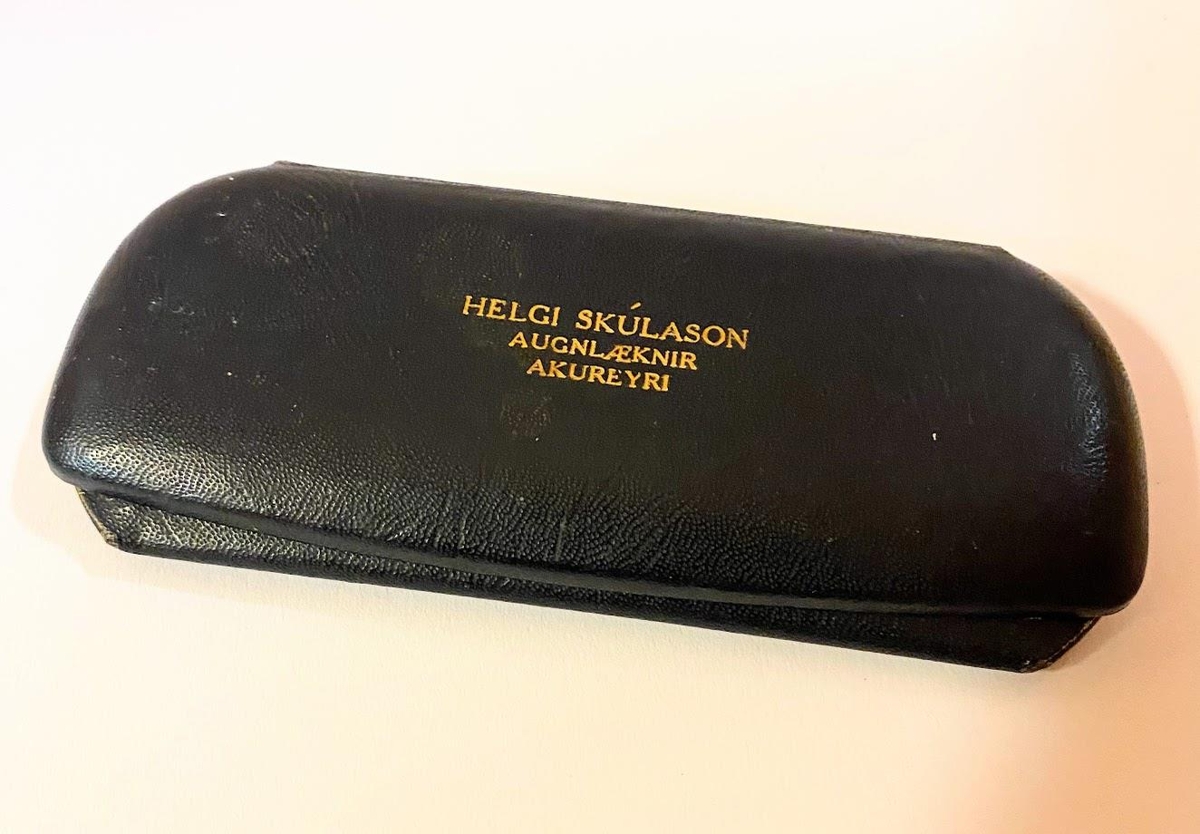 Gleraugnahulstur, árituð Helgi Skúlason augnlæknir Akureyri (f. 1892, d. 1983 ). Starfaði á Akureyri 1927 - 1967, fyrsti sérfræðingur á Íslandi sem starfaði utan Reykjavíkur.
