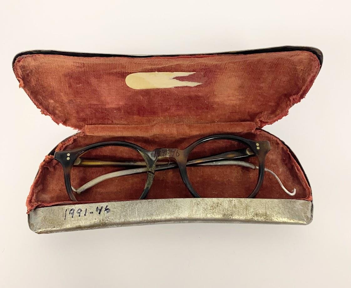 Gleraugnahús og gleraugnaumgjörð, fornlegt að sjá. Úr fórum Friðbjargar Jónsdóttur ljósmóður í Sandfellshaga II
