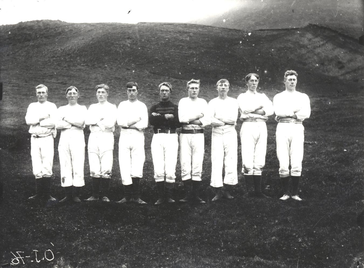 Glímumenn í Vík í Mýrdal. Frá vinstri: Ólafur Runólfsson, Brynjólfur Einarsson, Reyni, óþekktur, Þorsteinn Einarsson, Höfðabrekku, Þorsteinn Friðriksson, Litlu-Hólum, Nikulás Friðriksson, Einar Einarsson, Reyni, Bergsteinn Sigurðsson frá Dyrhólum og Haraldur Einarsson frá Kerlingardal.