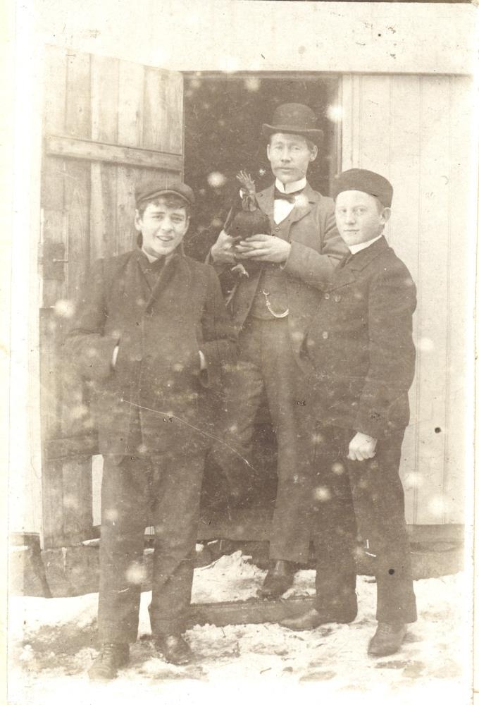 Bergsteinn Sigurðsson í Dyrhólum stendur í smiðjudyrum með hana í fanginu. Vinstra megin hans er Ólafur Jónsson, ljósmyndari frá Norður-Hvammi. Drengurinn með sixpensarann er óþekktur.