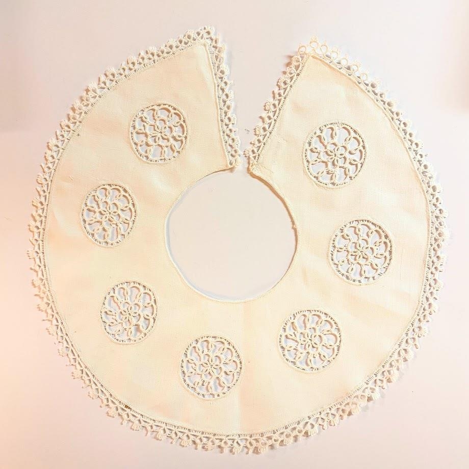Barnakragi með 7 orkereðum dúllum og blúndu. Unnið af Maríu Vilhjálmsdóttur handa börnum Bjargar Indriðadóttur, Víkingarvatni.