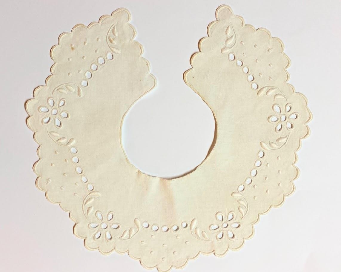 Kringlóttur barnakragi, útsaumaður með "franskbroderíi" og götum , unnin af Björgu Indriðadóttur á Víkingavatni.