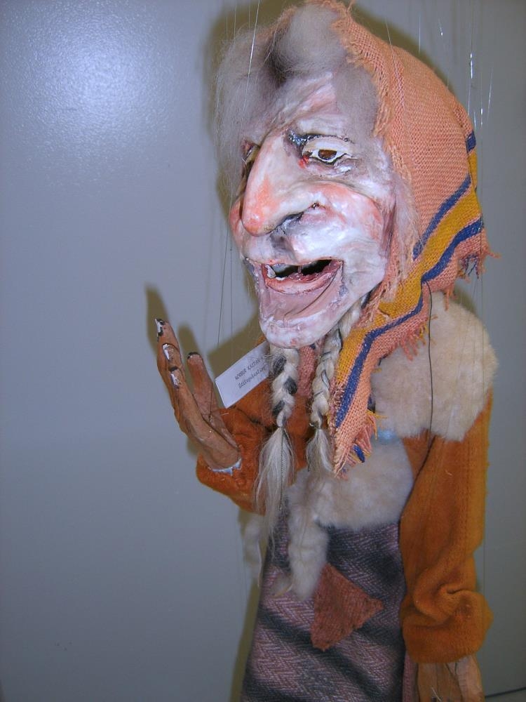 Strengjabrúða – Kerling. Útilegurkerling úr “Norður kalda Kjöl”. Andlit er mótað í pappír og apaskinn? og málað og lakkað. Hendur og fætur er skorinn út í tré