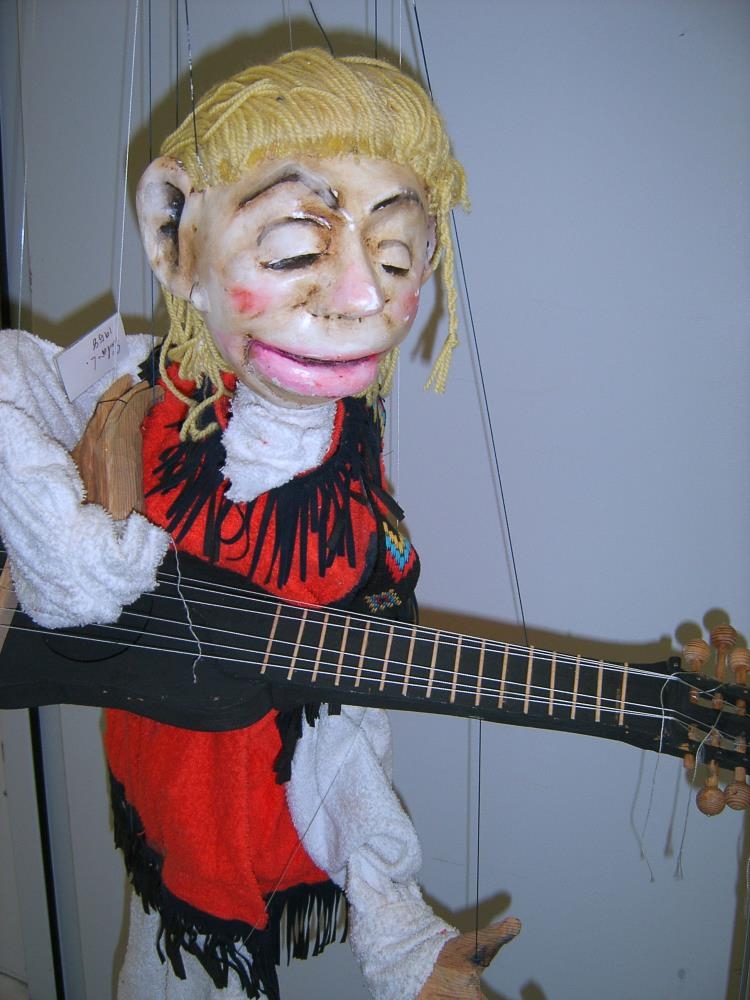Strengjabrúða – Gítarleikari. Brúðan er í hvítri skyrtu og rauðu vesti með svörtu kögri. Hún heldur á gítar. Andlit er úr pappamassa og málað, hendur og fætur eru skorin út í tré.