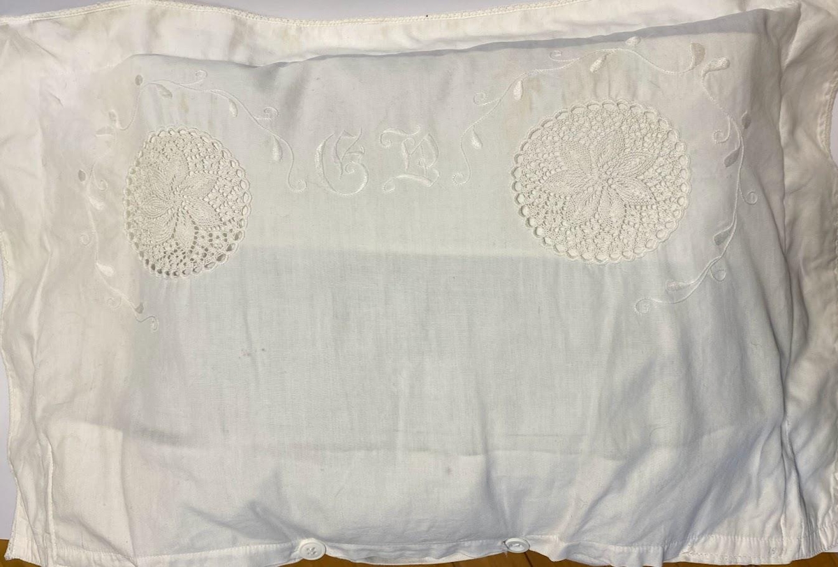 Svæfilver, sýnir fallega vinnu, saumað laufamynstur með hvítu og flatsaumur, tvær prjónaðar dúllur kappmelltar í, örmjó útlend blúnda í kringum verið, stafir í miðju G.Þ. (Gunnlaug Þórðardóttir), móðir Þórunnar sem saumaði svæfilsverið fyrir móður sína sem unglingur.