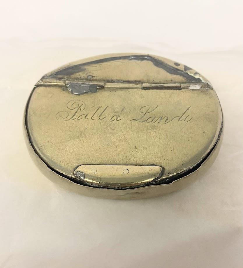 Tóbaksdós með áritun "Páll á Landi". Úr eigu Margrétar Pálsdóttur (f.1887) á Austaralandi í Öxarfirði. Gefandi Halldóra Egilsdóttir fósturdóttir hennar. Páll Jóhannesson var bóndi á Austara-Landi 1888-1937 og líklegur eigandi dósarinnar.