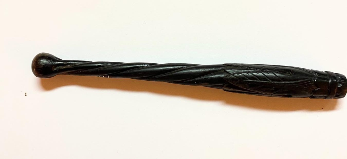 Pennastöng úr hörðum viði, fagurlega útskorin með snúnu mynstri á skafti og blómamynstri neðantil. Úr eigu Sigurðar Gunnarssonar (f.1912) síðar skólastjóra.