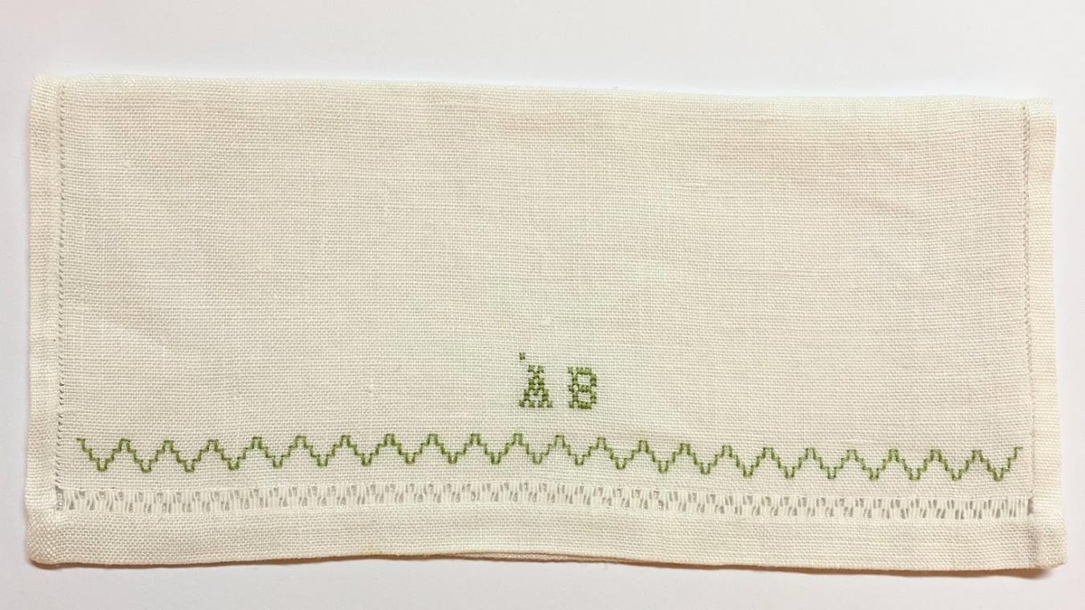 Servíettupoki, hvítt hör, útsaumað með grænu. Stafirnir ÁB. Gert á Húsmæðraskólanum á Laugarlandi í Eyjafirði af Ástu Björnsdóttur