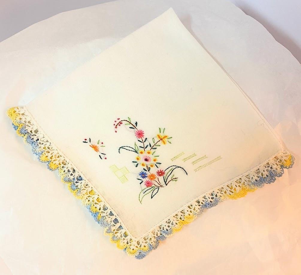 Vasaklútur, hvítur með handbróderuðu munstri í litum, keyptur en Gunnþórunn hklaði í kring með hvítu, gulu og bláu heklugarni, um 1981