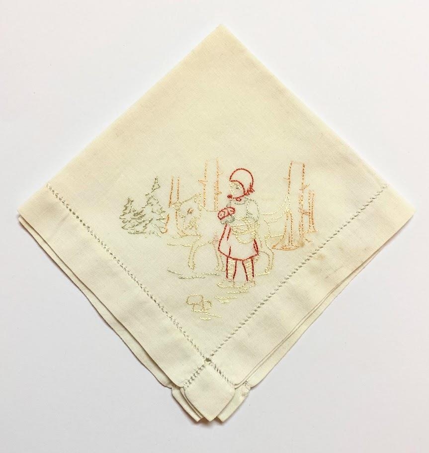 Vasaklútur með ísaumaðri mynd af Rauðhettu og úlfinum, húlfaldur í kring . Unnið af Kristveigu Björnsdóttur, húsfreyju á Valþjófsstöðum.