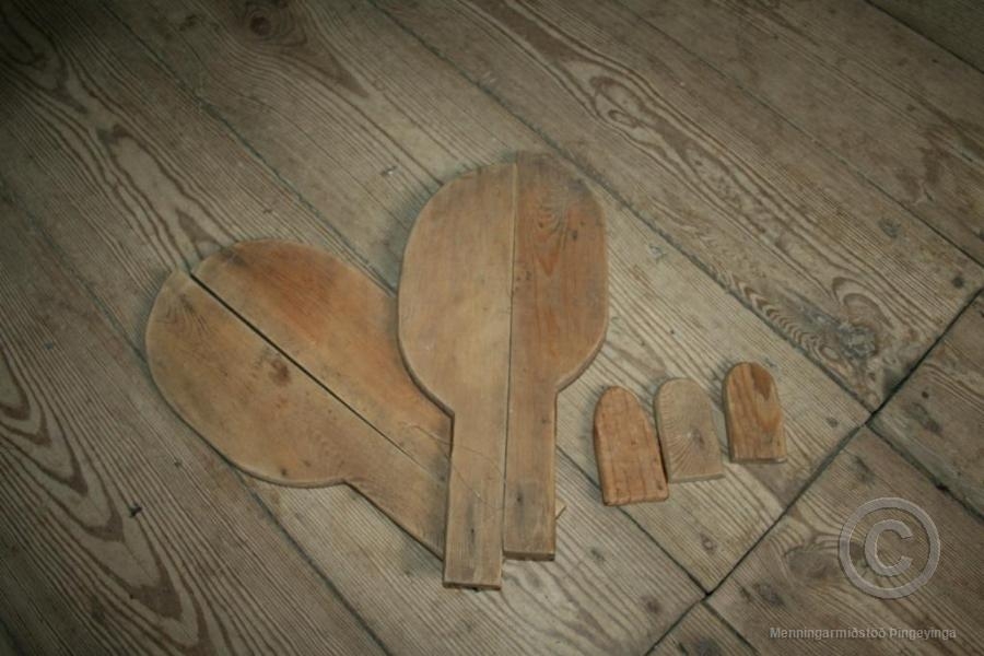 Vettlingatré, tvenn, lögð saman í miðju, ætluð fyrir smáband. Lengd 34.5 cm, breidd 16 cm. Þrír þumlar fylgja.