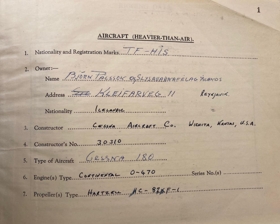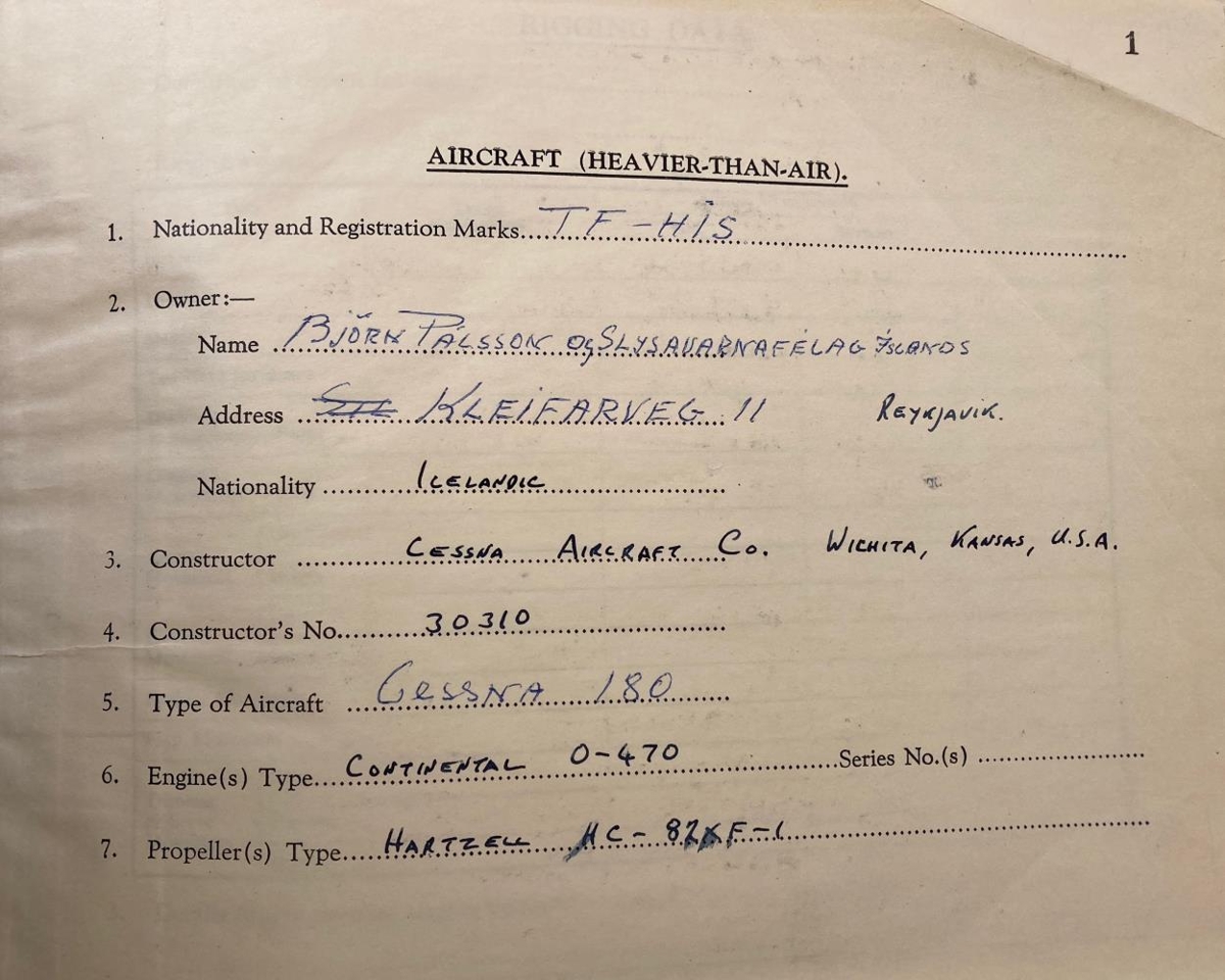 Logbók flugvélarinnar TF-HIS, Cessna 180. Bókin er fimmta logbók vélarinnar, blá að lit og með harðri kápu. Með svörtum prentuðum stöfum stendur: "Ministry of Civil Aviation", "Form C.A. 27" og "Aircraft Log Book". Þá hefur verið handskrifað á hana: "Bók no 5. 24/8 56-21/5 58. TF- HIS. TF-HIS #3B".