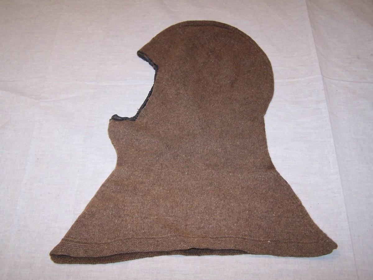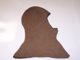 Mývatnshettan er prjónuð úr mórauðu þelbandi. Jaðrar á opi fyrir andliti faldaðir með svartri lasting.