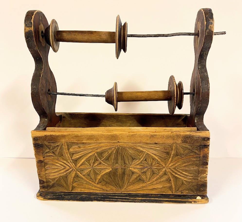 Snældustóll, með tveimur snældum útskorinn af Sigurði Jónssyni, með “karveskurd”. Stærð: L 24 x B 10 H 26 cm.