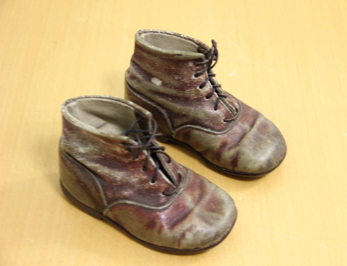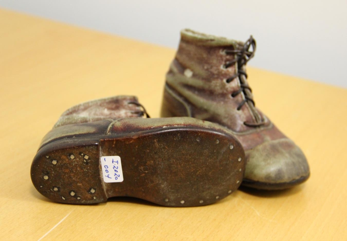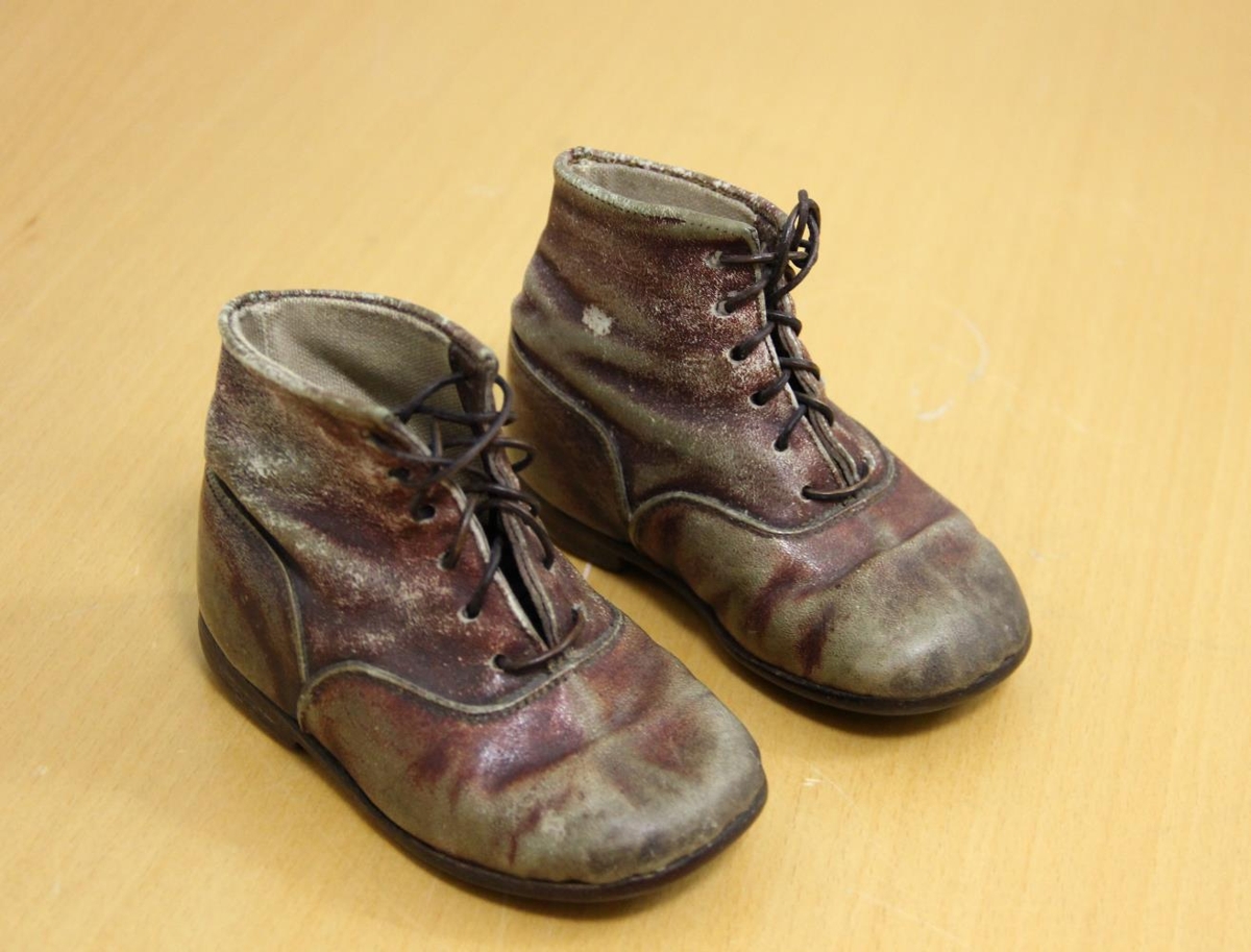 Reimaðir barnaskór úr brúnlituðu leðri. Pétur smíðaði skóna á son sinn.