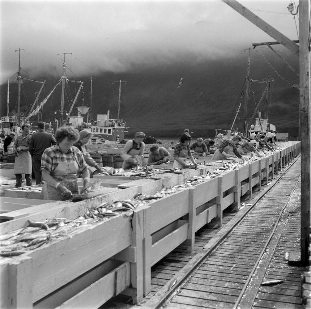 193 Eyjafjarðarsýsla. Siglufjörður. Síldarsöltun á söltunarstöð O. Henriksen. Ásgrímur Einarsson (Bóbó Theu) lengst til vinstri. Fremst á myndinni er Kristín Björg Baldvinsdóttir (Lóa Bald). Fjær eru síldarskipin Ólafur Magnússon og Mummi úr Garði.