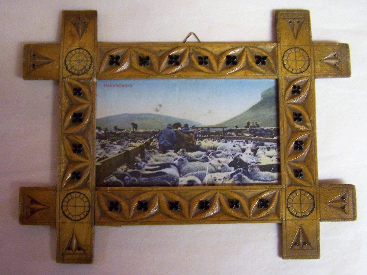 Rammi sem Helgi Gunnlaugsson skar út. Gefin af Guðmundi Jónssyni, Ærlæk. Ljósbrúnn með dökkbrúnum útskornum og lituðum laufum og hringjum. Stærð: 22x17 cm.