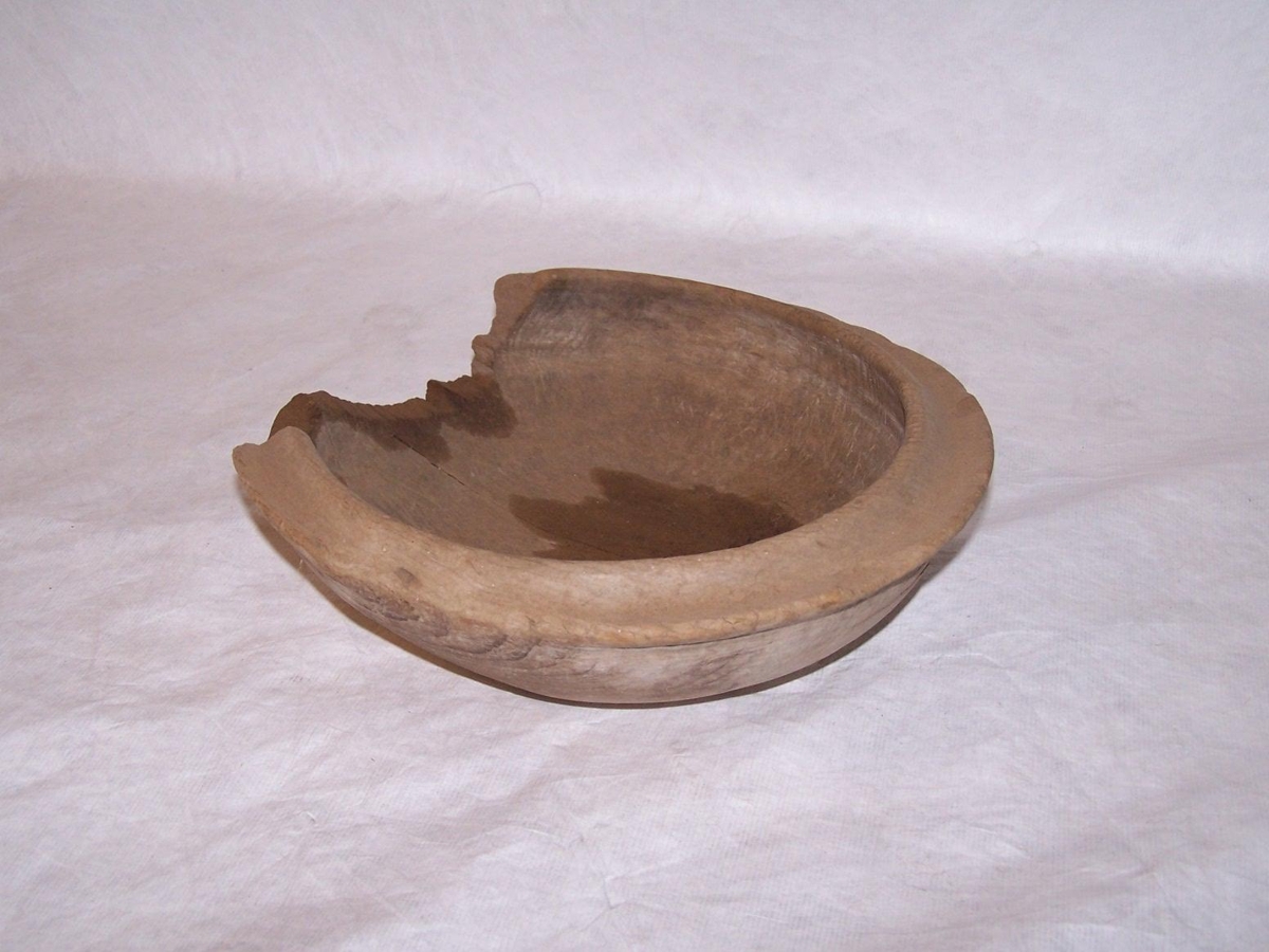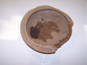 Skálin mjög svipuð nr. 119, örlítið minni en úr sama efni. Brotið í hana allstórt skarð og stykkið týnt. Ekki er sjáanlegt neitt tappagat.