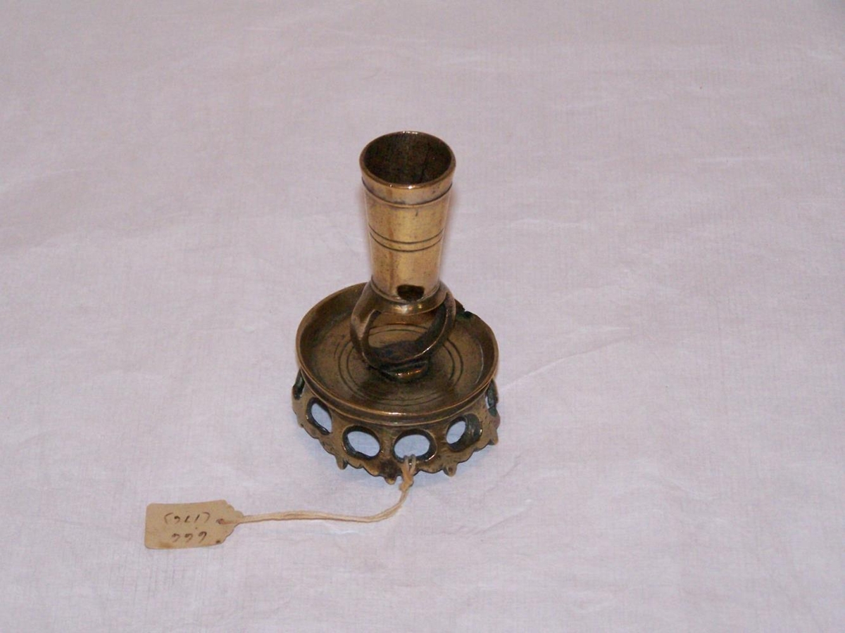 Kertahaldari úr ljósakrónu úr Lundarbrekkukirkju. Kopar, lítill diskur um 5 cm í þvermál, niður úr neðri röð grindahringur. Upp úr miðjum diski hringur, festur á röð og myndar fót undir stútinn sem kerti er sett í. Var gefinn Á.J. (sem var frá Rauðá í Bárðardal) er hún var barn (f.1875).