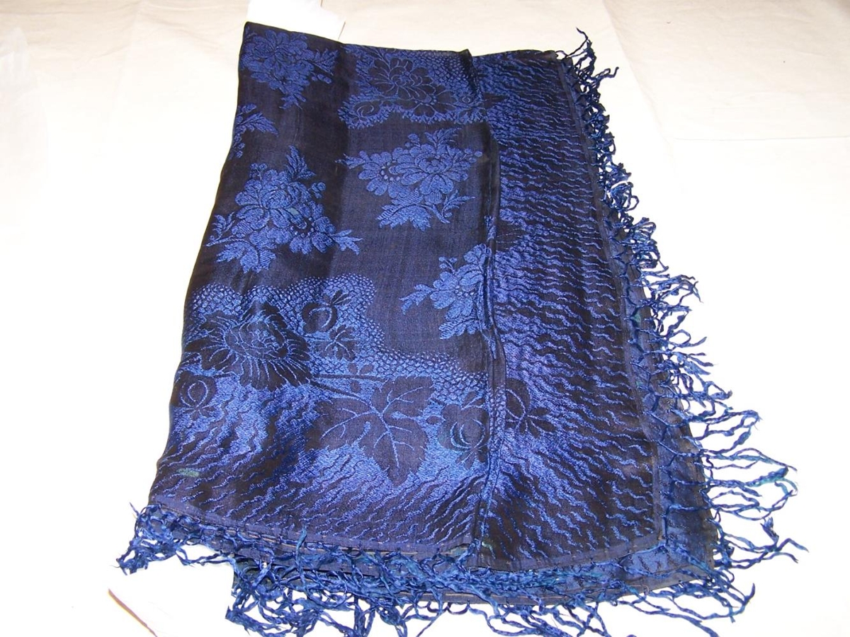 Silkiklútur. Stærð: 120 x 116 cm. Blásvartur grunnur með dökkbláum rósum. Blár kögur allt í kring. Klúturinn keyptur 1861 á Akureyri. Kostaði 85 sk.