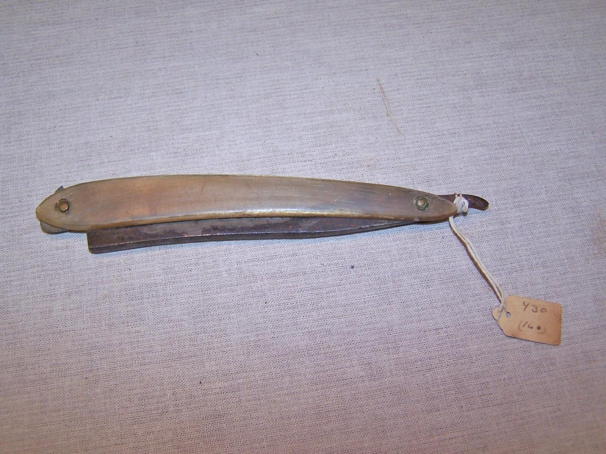 Er með ljósu, gulleitu hornskafti. Var skegghnífur Helga Jónssonar, hreppstjóra á Grænsavatni.