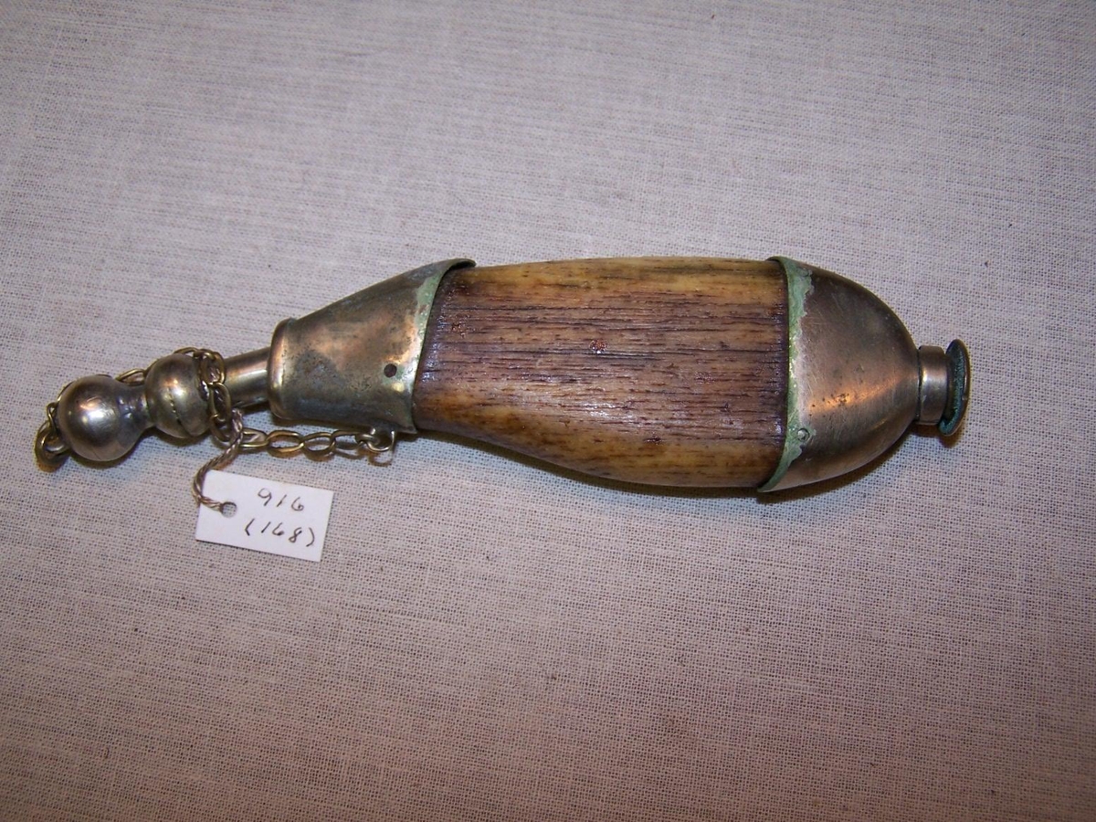 Efni tönn, silfurbúin, Tappi í festi. Lengd alls með tappa 14.5 cm. Mesta breidd 3.5 cm.