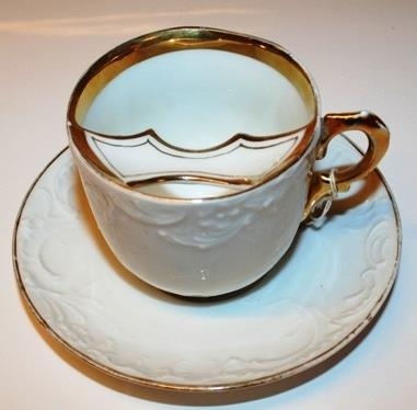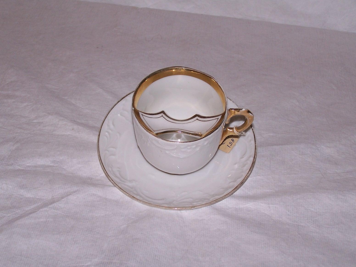 Skeggbolli - hvítur og gylltur með upphleyptri skreytingu. Heill og óskemmdu. Hæð á bolla 7,5 cm - þvermál 8,5 cm þvermál á undirskál 14,5 cm