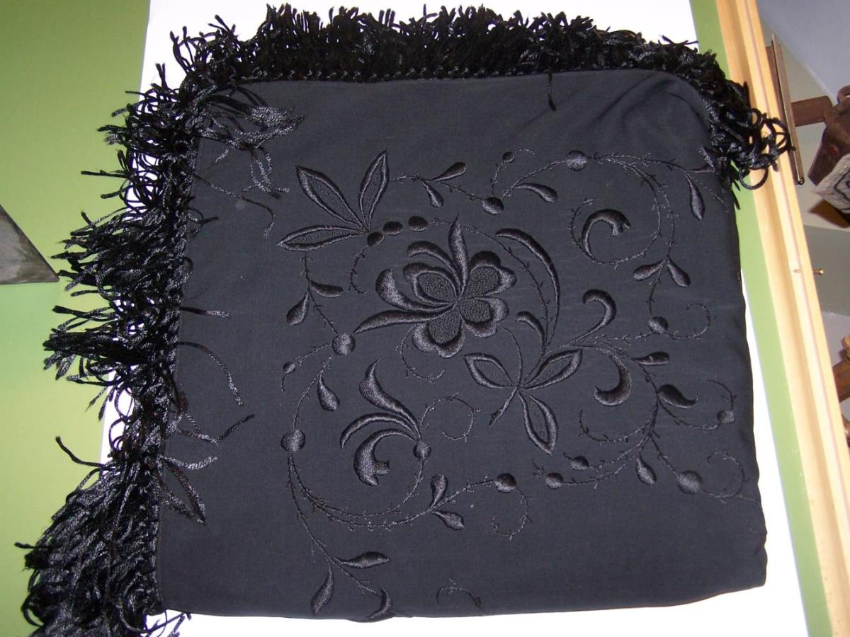 Sjal. Það átti Sigurlaug Guðnadóttir, saumakona, ömmusystir gefanda. Var notað við peysuföt og upphlut. Silkisefjótt og silki og kögri og útsaum.