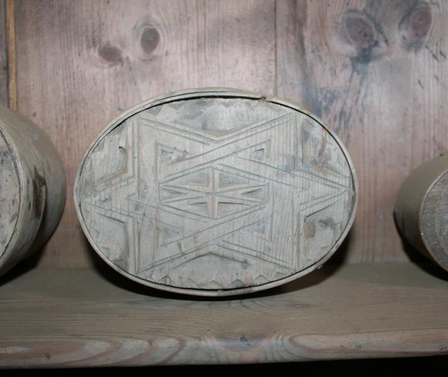 Svigar úr beyki, botnar fura. Saumað með horni. Útskurður svipaður og á nr. 55 - 60. Í stað stjörnu í miðju eru 4 þríhyrningar