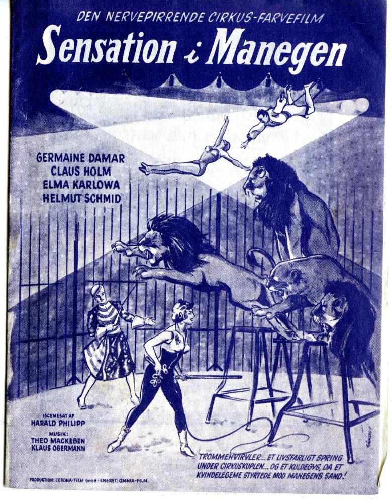 Efst á forsíðu stendur: "Den nervepirrende cirkus-farvefilm Sensation i Manegen."