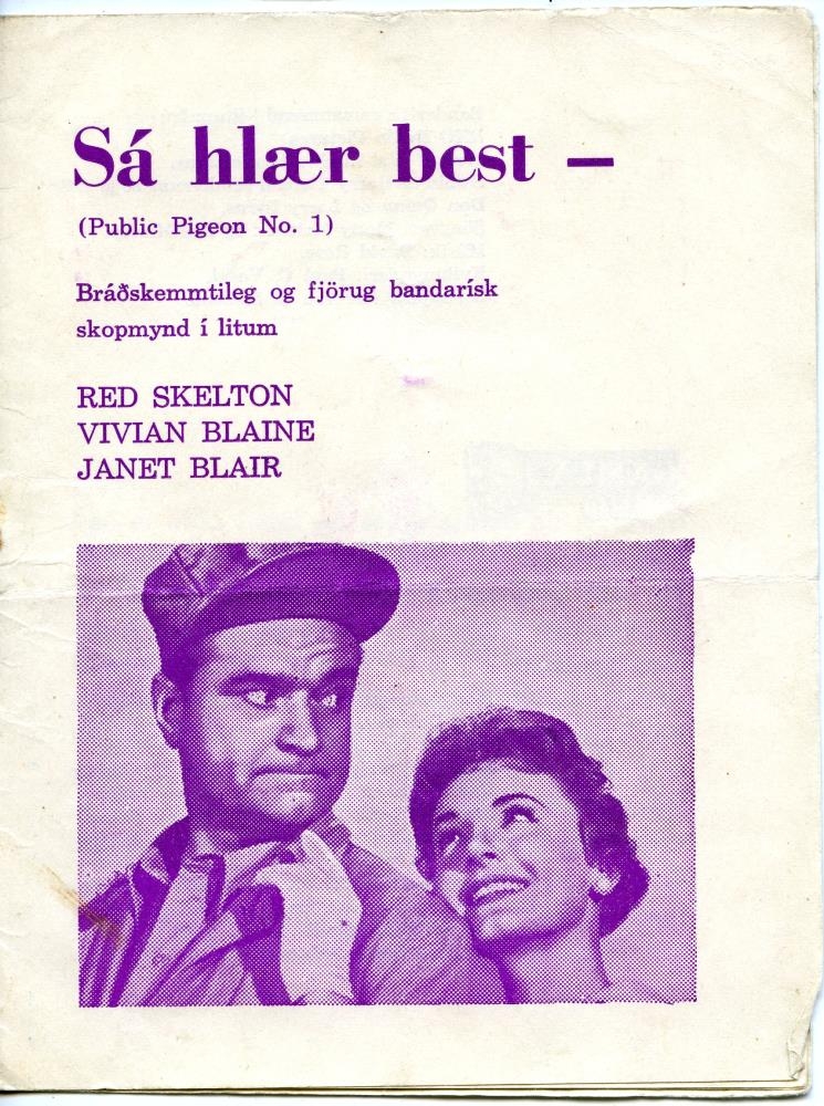 Á forsíðu stendur: "Sá hlær best - (Public Pigeon No. 1). Bráðskemmtileg og fjörug bandarísk skopmynd í litum. Red Skelton. Vivian Blaine. Janet Blair."