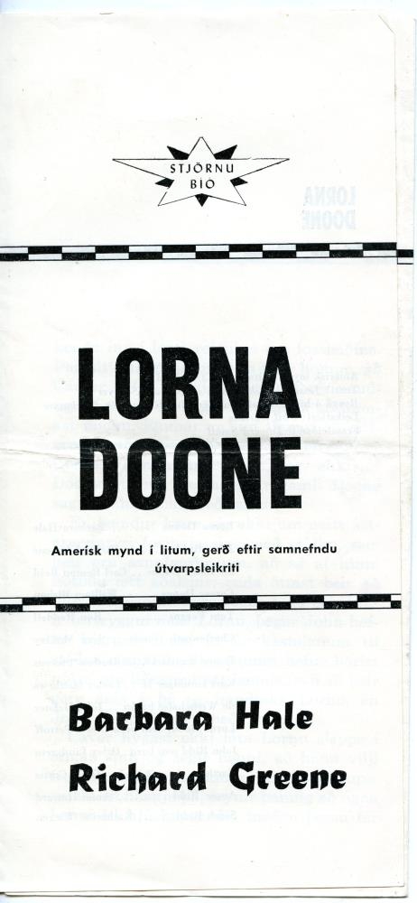 Á forsíðu er lógó Stjörnubíós. Það fyrir neðan stendur: "Lorna Doone. Ameríks mynd í litum, gerð eftir samnefndu útvarpsleikriti. Barbara Hale. Richard Greene."