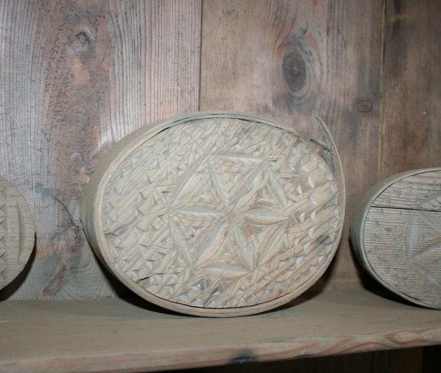 Svigar úr eik, neðri botn úr beyki og efri botn (lok) úr furu. Saumaður með tágum. útskurður svipaður og á nr. 55 - 57.
