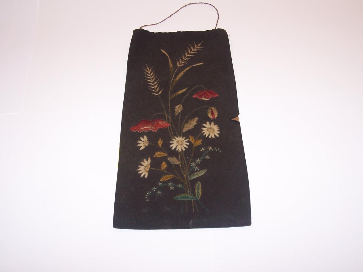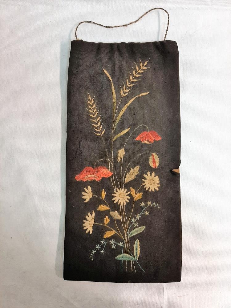 Blaðslíðra (slíður?). Hæð 39 cm, breidd 18.5 cm. Í framhliðina saumaður blómvöndur, kornstengur, valmúi o.fl. Litir farnir að mást (1959) en eru sem grænir, rauðir og brúnir. Grunnur svartur. Slíðran nokkuð slitin og byrjuð að brotna.