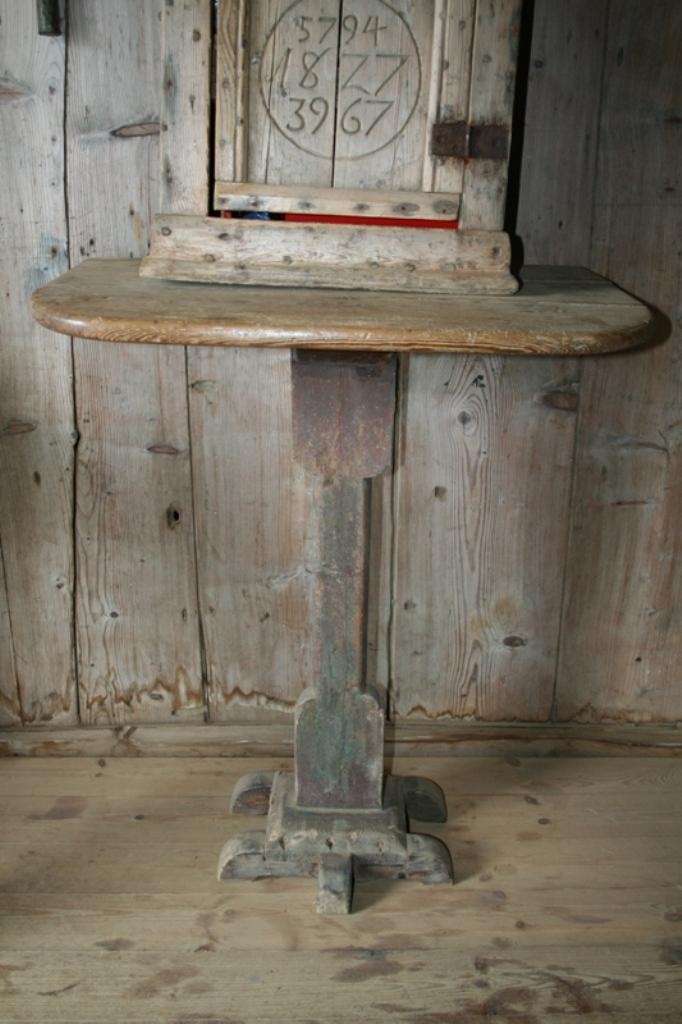 Borð. Borðplata 70 x 46.5 cm. Tvö horn ávöl en tvö hvöss. Fótur einn 12.5 cm breiður og 2.5 cm þykkur,efst og neðst, en keildur