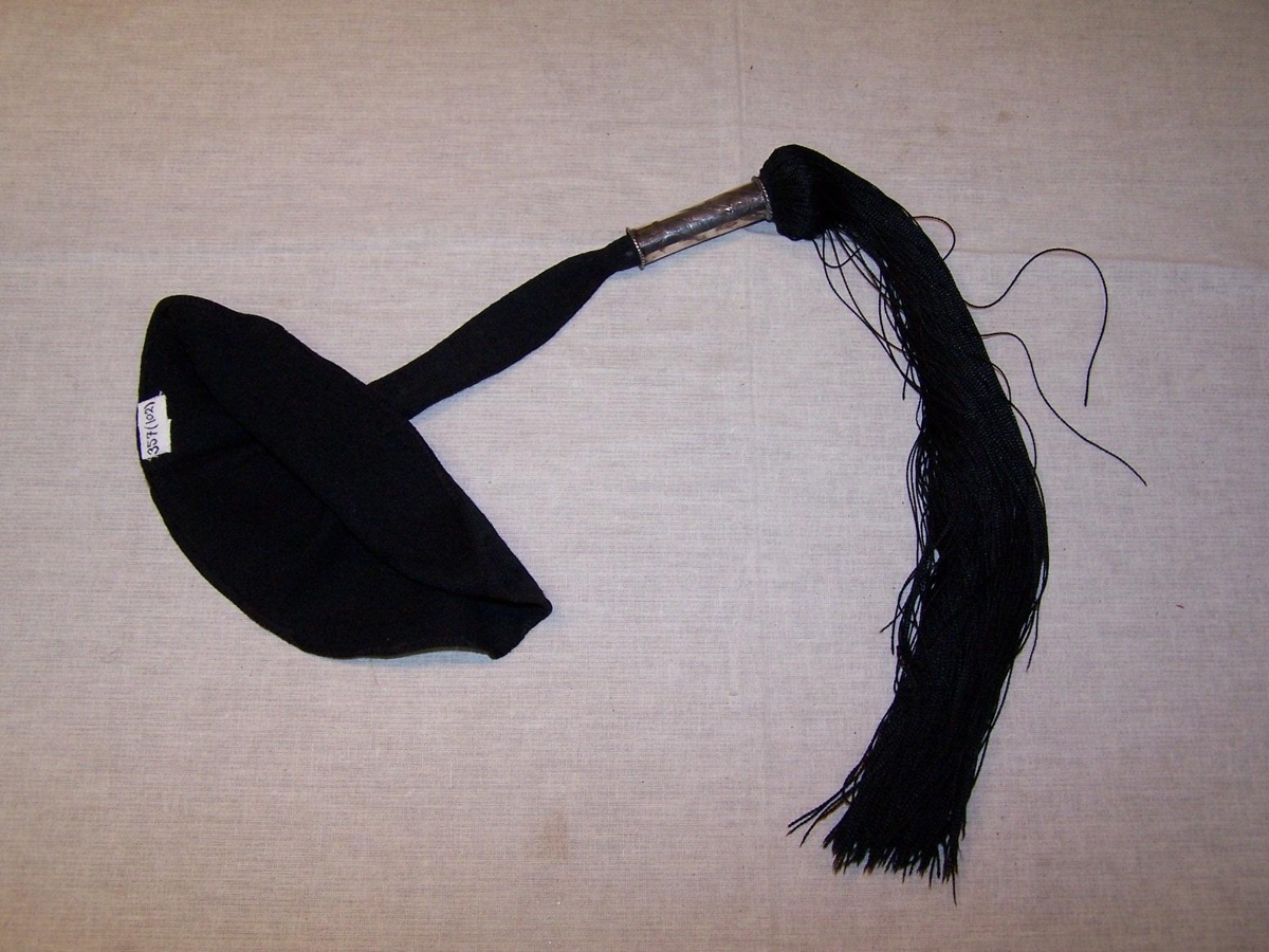 Rakel Rósamunda Kristjánsdóttir mun hafa prjónað og tætt. Hólkur úr silfri. Skúfur af lengri gerðinni. Fylgir húfuprjónn með svörtum haus.