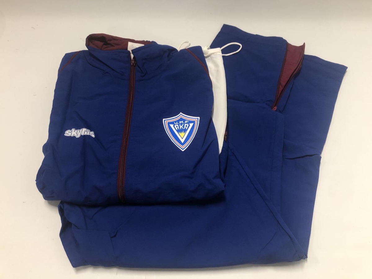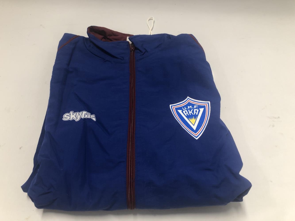 Íþróttagalli, buxur og peysa. Dökkblár, hvítur og vínrauðar línur og rennilás. Merki Ungmennafélagsins Vöku á brjósti vinstra megin. Auglýsing hægra megin, skyr.is.