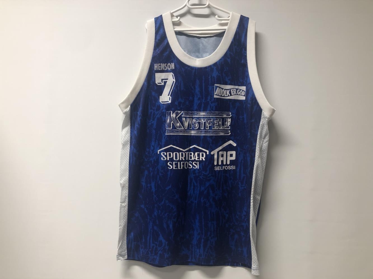 Körfuboltabúningur, stuttbuxur og bolur. Blár og hvítur. Merktur Vöku á bakhlið og á buxnaskálm. Auglýsingar m.a. frá Sportbæ, MS og Kvistfelli.