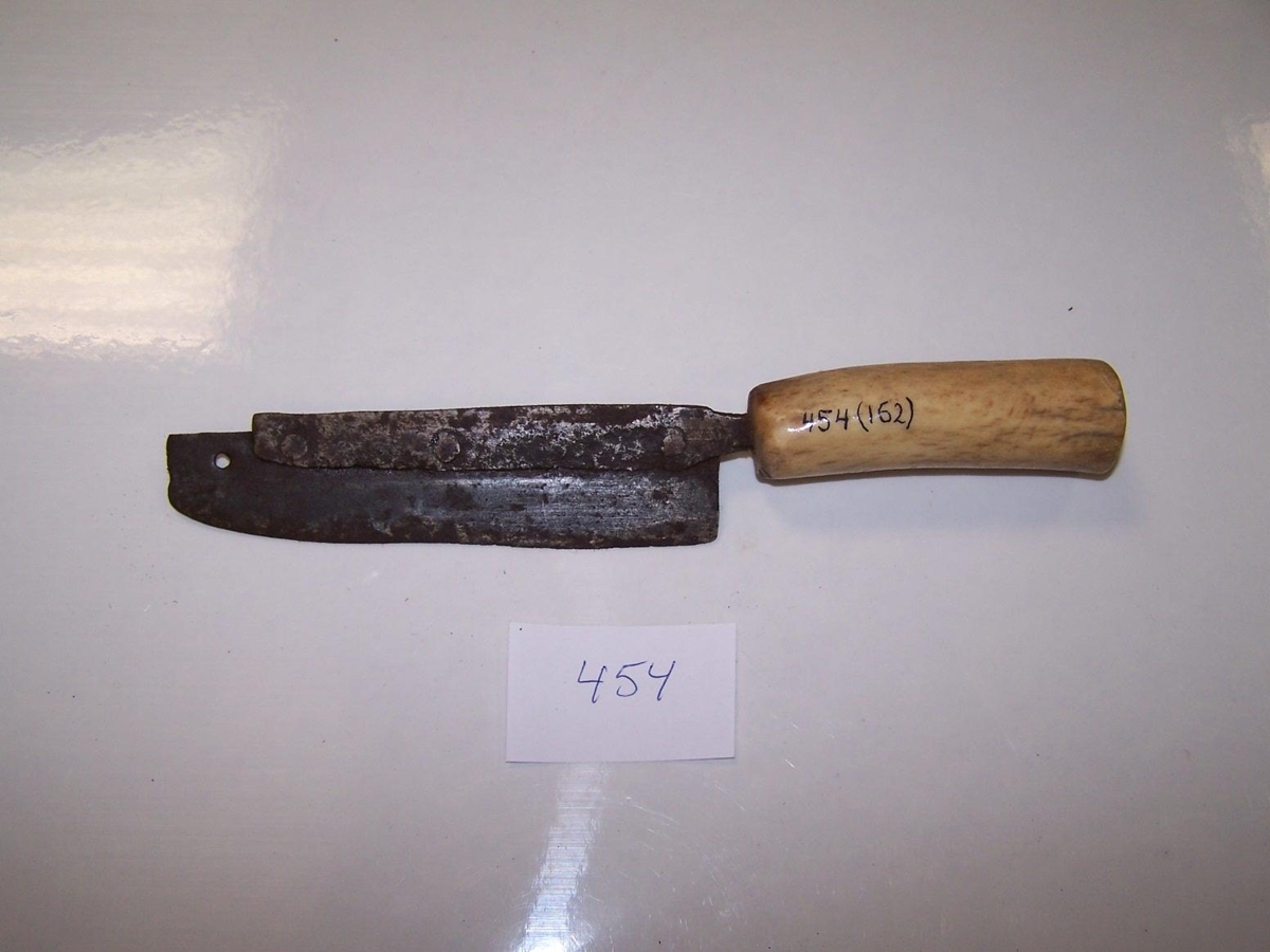 Gæruhnífur. Blaðlengd 12.5 cm, skaft 8 cm. Blað úr ljáblaði, hnoðað á bakka. Tangi úr bakkanum gengur í beinskaft.