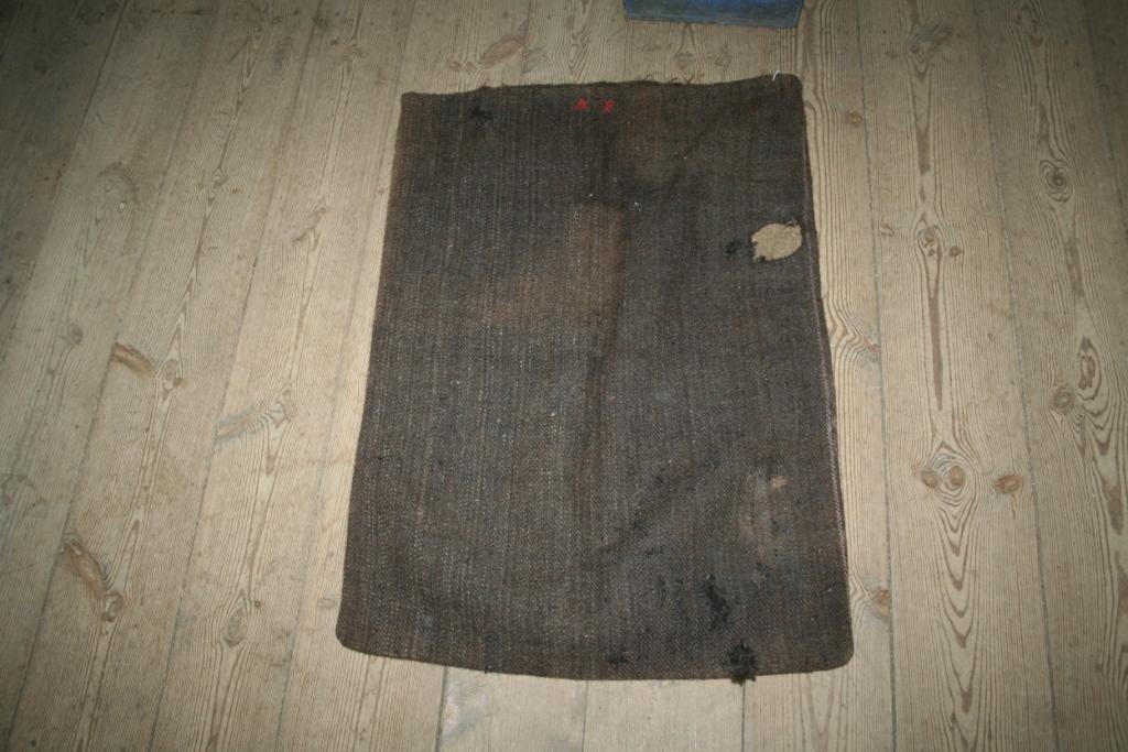 Stærð: 88 x 65 cm. Litur mósvartur (samkembt), einlitur. Pokinn nokkuð táinn og slitinn. Bættur með bót af öðrum lit.