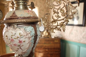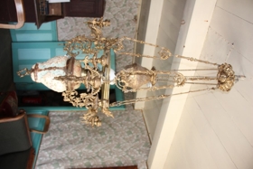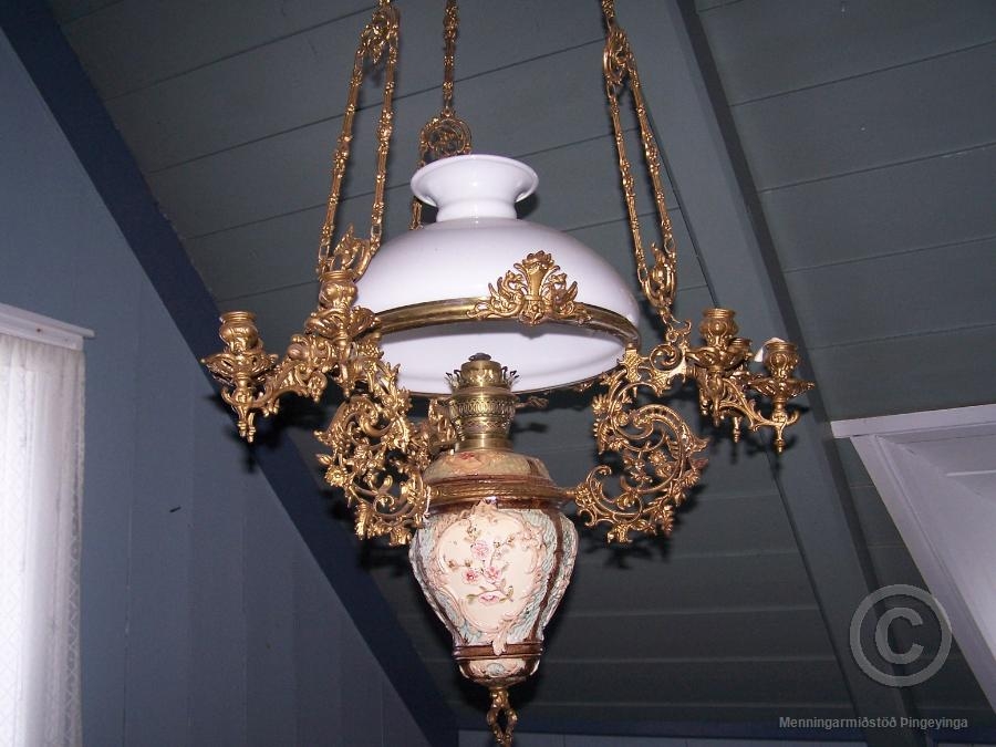 Hengilampi - blysbrennari -Lampinn í festum og færist upp og niður með þungu lóði. Hvítur postulíns kúpull nl. 33 í þvermál. Allur er lampinn íburðarmikill. Utan á grind, sem hjálmurinn hvílir á, eru þríarma kertastjakar. Olíugeymir er í marglitu og munstruðu geymsluhúsi. Glas 18 tommu. Þetta var brúðargjöf 1915 til Jónas Helgasonar og Hólmfríðar Þórðardóttur frá fjölskyldu Jóns Jónssonar, sem kenndur var við Múla, þá á Seyðisfirði. Lampinn keyptur nálægt aldamótum 1900, líklega á Seyðisfirði.