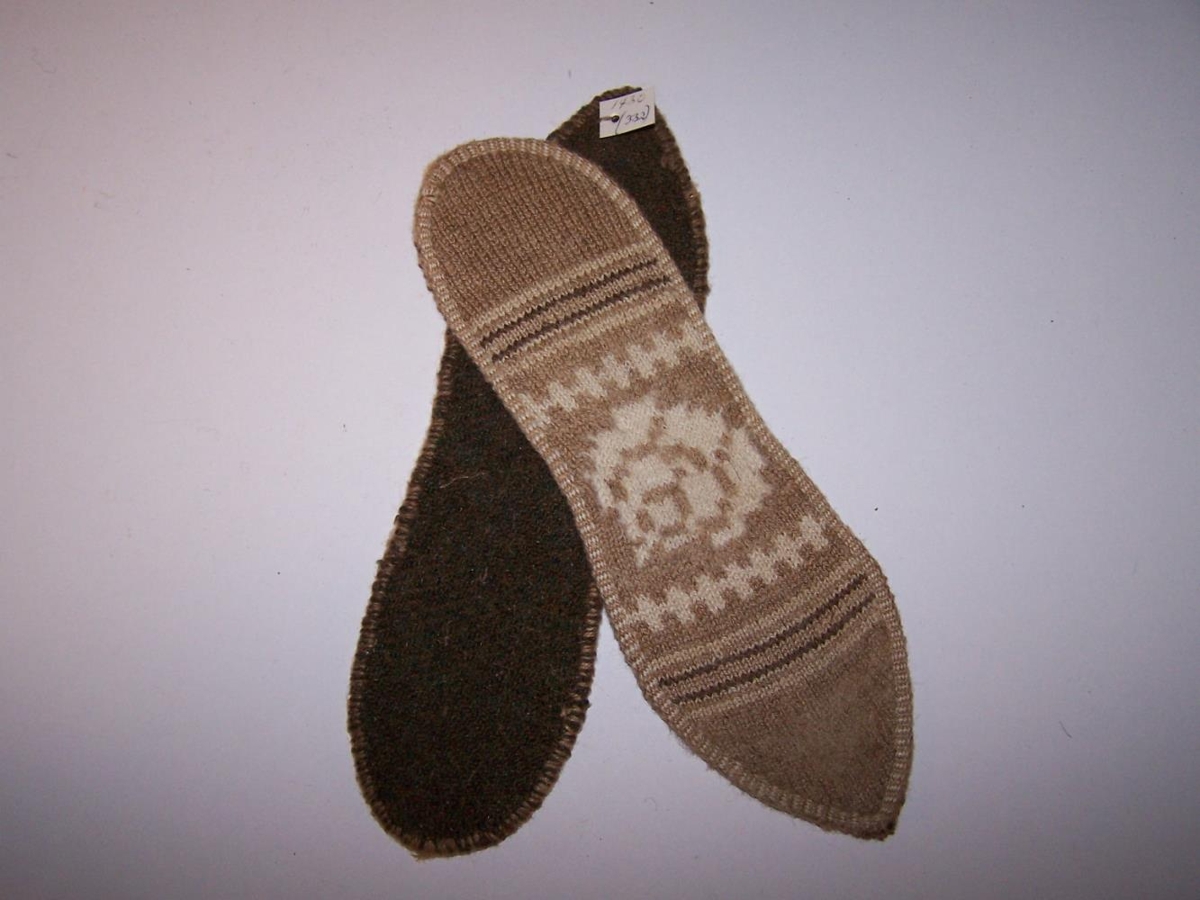 Íleppar. Ljósmórauðir í grunninn með hvítri rós og sauðsvörtum og hvítum röndum. Prjónaðir á fína skotthúfuprjóna.
