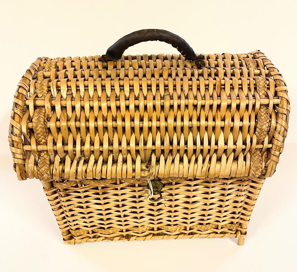 Tágakarfa, eins og lítil kista í laginu. Úr búi á Víkingavatni fyrir 1930, síðast í eigu Guðrúnar Kristjánsdóttur frá Víkingavatni, gefin af henni.