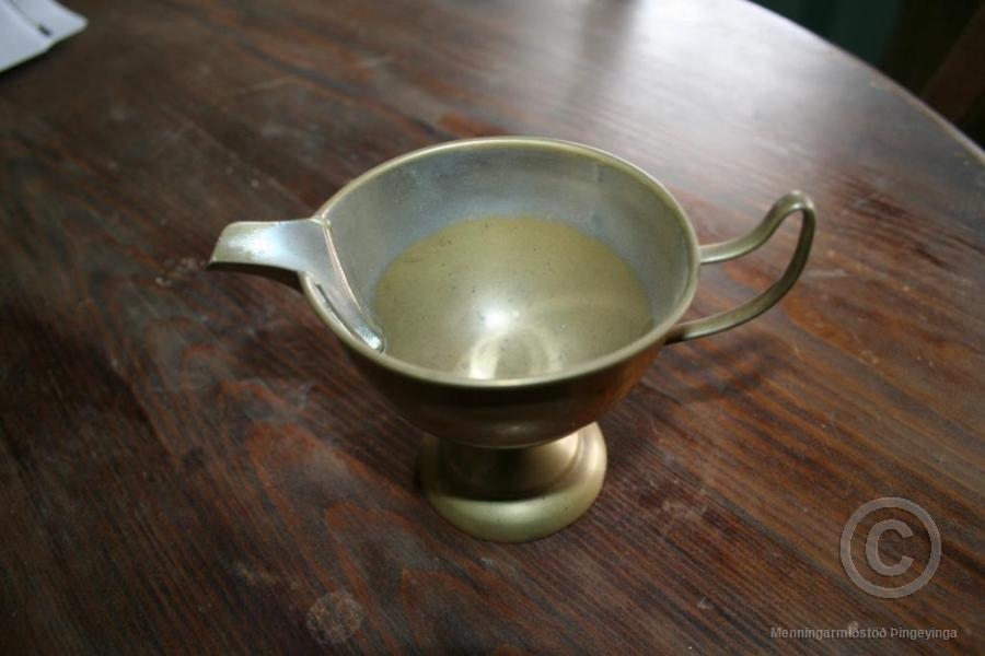 Rjómakanna úr messing. Var gjöf frá eiginmanni G.O. Guðmundi Friðjónssyni frá Sandi.