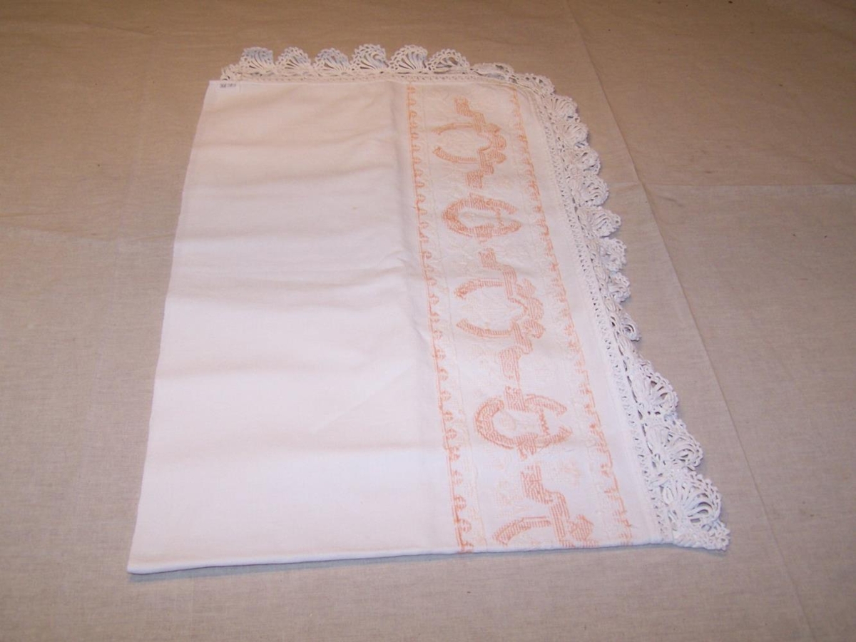 Dúkur, útsaumaður. Lengd 124 cm, breidd 37 cm. Blúnda hekluð fyrir endum og framröð, 6 cm breið, úr hvítu garni. Í dúknum skammt frá blúndunni er útsaumsbekkur, 13 cm breiður í ljósbrúnum og mjög ljósbrúnum lit. Dúkurinn úr hvítum bómullargarns jafi.