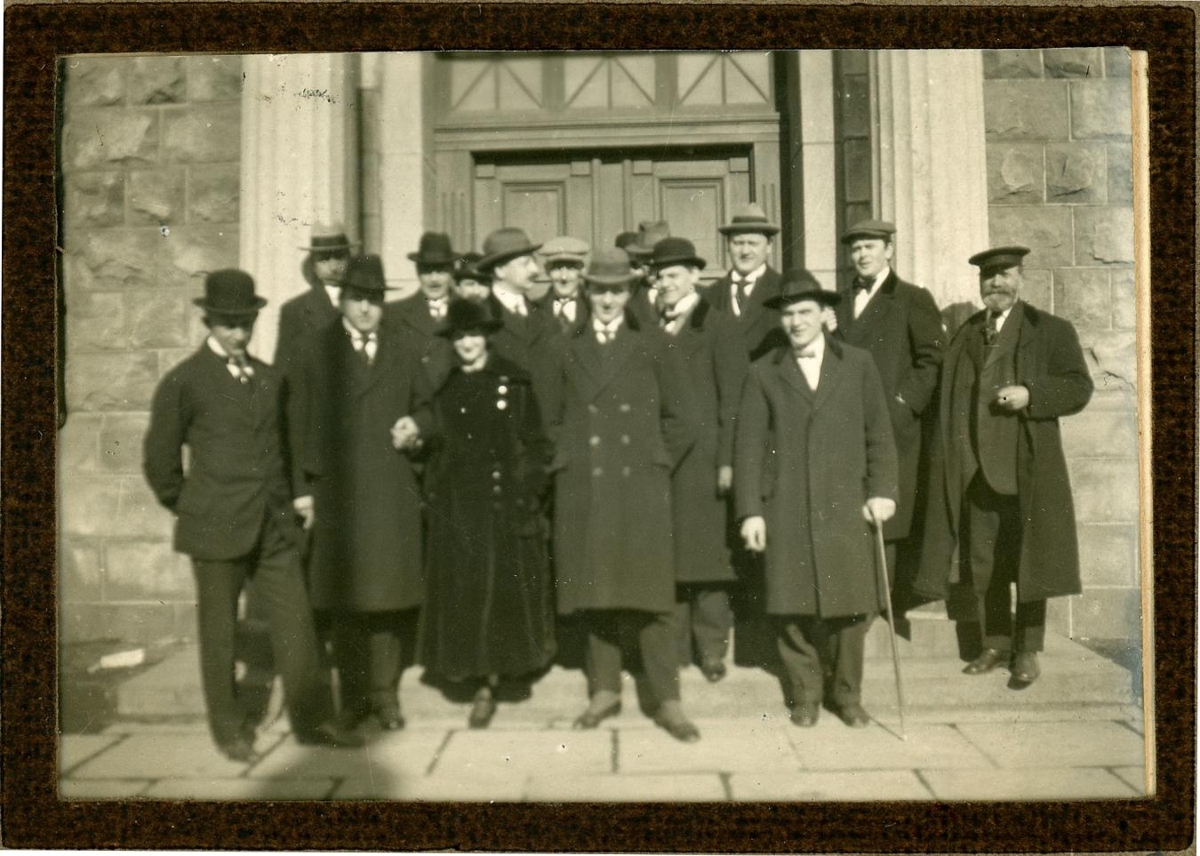 Undir myndinni er skrifað: Starfsfólk Íslandsbanka. Haraldur Johannessen með kúluhatt fyrir miðju.