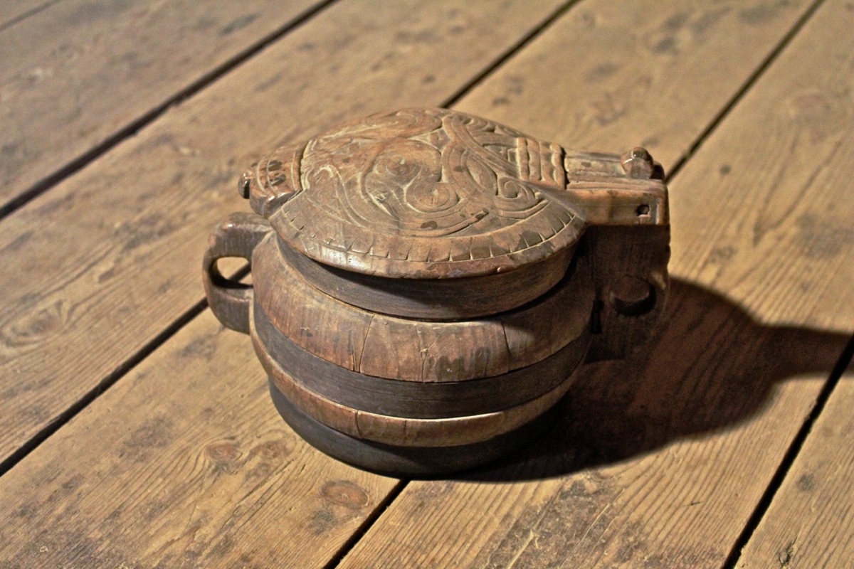 Utanmál við op 46 cm, við botn 48 cm, um miðgjörð 54 cm, Eyru fremnur smá og lítið skreytt. Lok útskorið, Gjarðir úr tré.